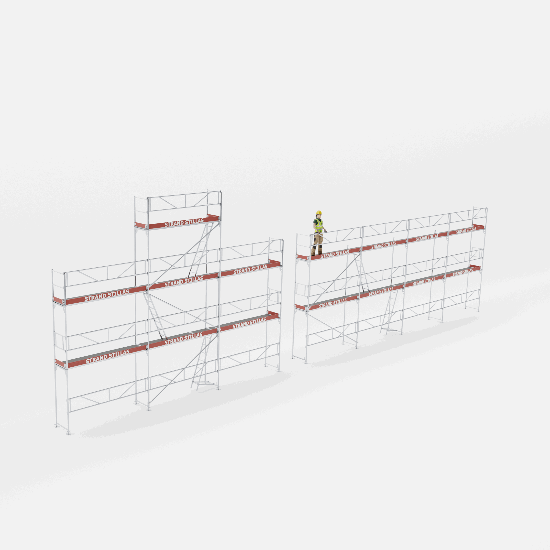 Kompositt pakkene leveres med hovedkomponenter i aluminium. Stillasgulv med sklisikker, lettvekts kompositt på ramme av aluminium.