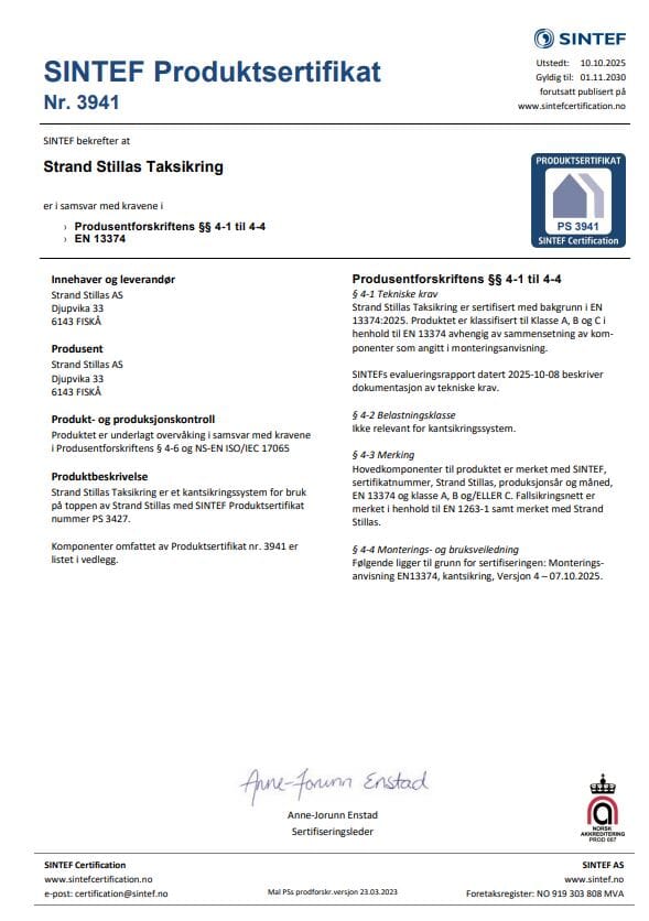 - Sertifisert sikkerhet - STRAND STILLAS Taksikring er testet og sertifisert av SINTEF i henhold til Kantsikringsstandarden EN13374, og kan brukes som taksikring fra 0 – 60 grader takvinkel.