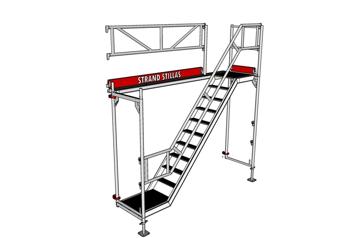 Hver etasje i stillaset kan enkelt og trygt entres via trappetårnet, noe som sikrer fleksibel og effektiv tilgang under arbeid.