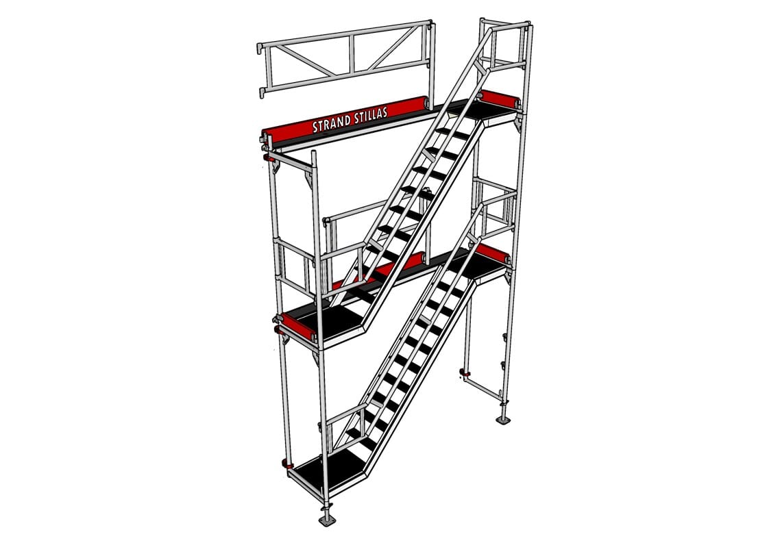 Hver etasje i stillaset kan enkelt og trygt entres via trappetårnet, noe som sikrer fleksibel og effektiv tilgang under arbeid.