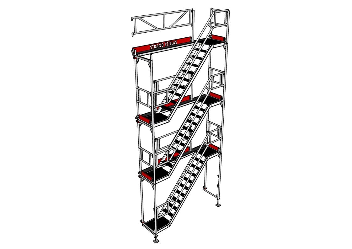 Hver etasje i stillaset kan enkelt og trygt entres via trappetårnet, noe som sikrer fleksibel og effektiv tilgang under arbeid.