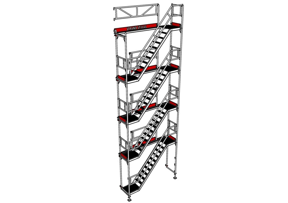Hver etasje i stillaset kan enkelt og trygt entres via trappetårnet, noe som sikrer fleksibel og effektiv tilgang under arbeid.