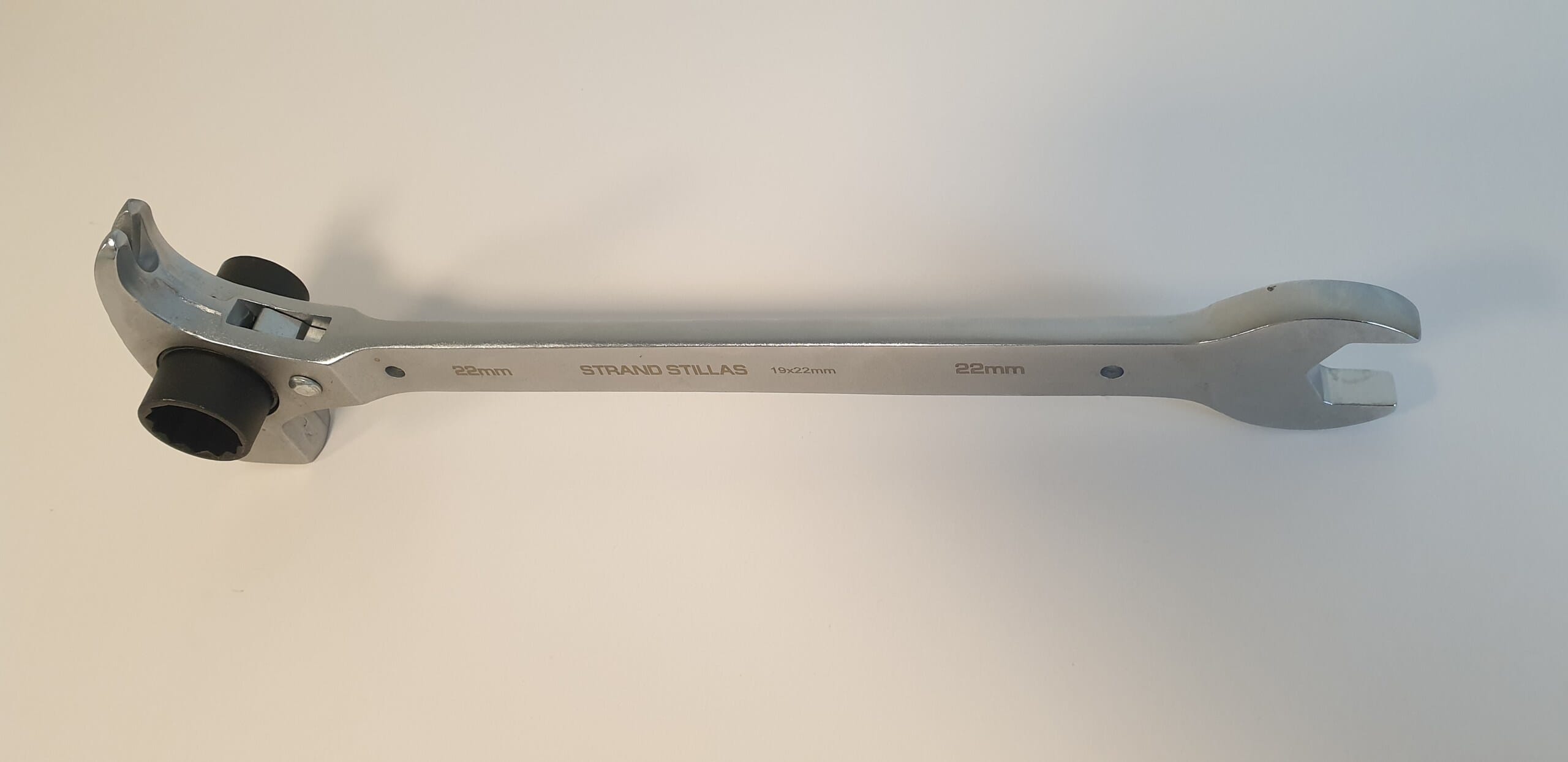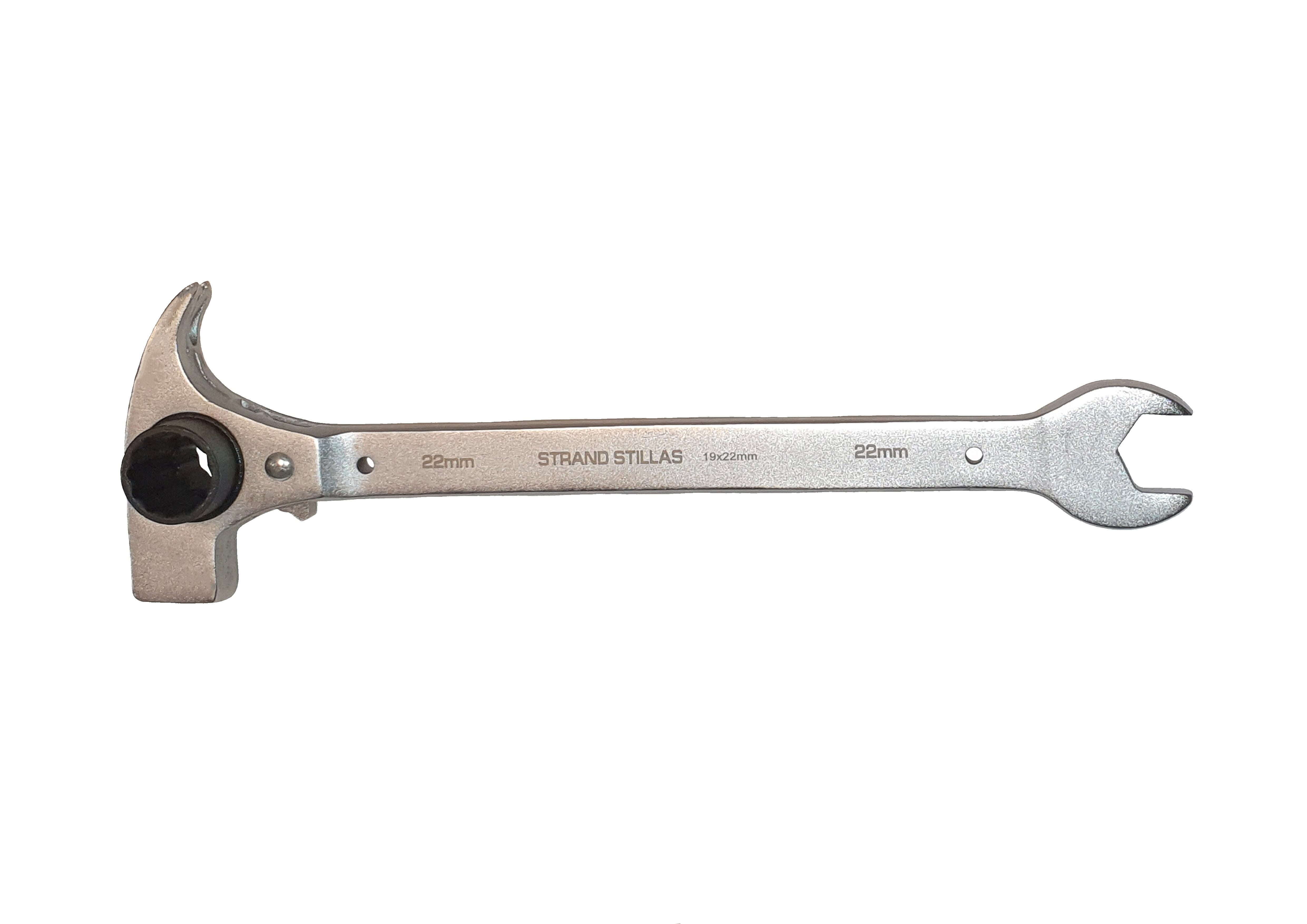 Stillas multitool med skralle 19/22 mm. Hammer med klo og stillasskralle i ett verktøy. Med fastnøkkel i enden av håndtaket er dette det ultimate verktøyet til profesjonell stillasbygging. Med 2 stk festehull for sikkerhetsline i håndtaket, så har en valgmuligheter. Vekt 850 g.