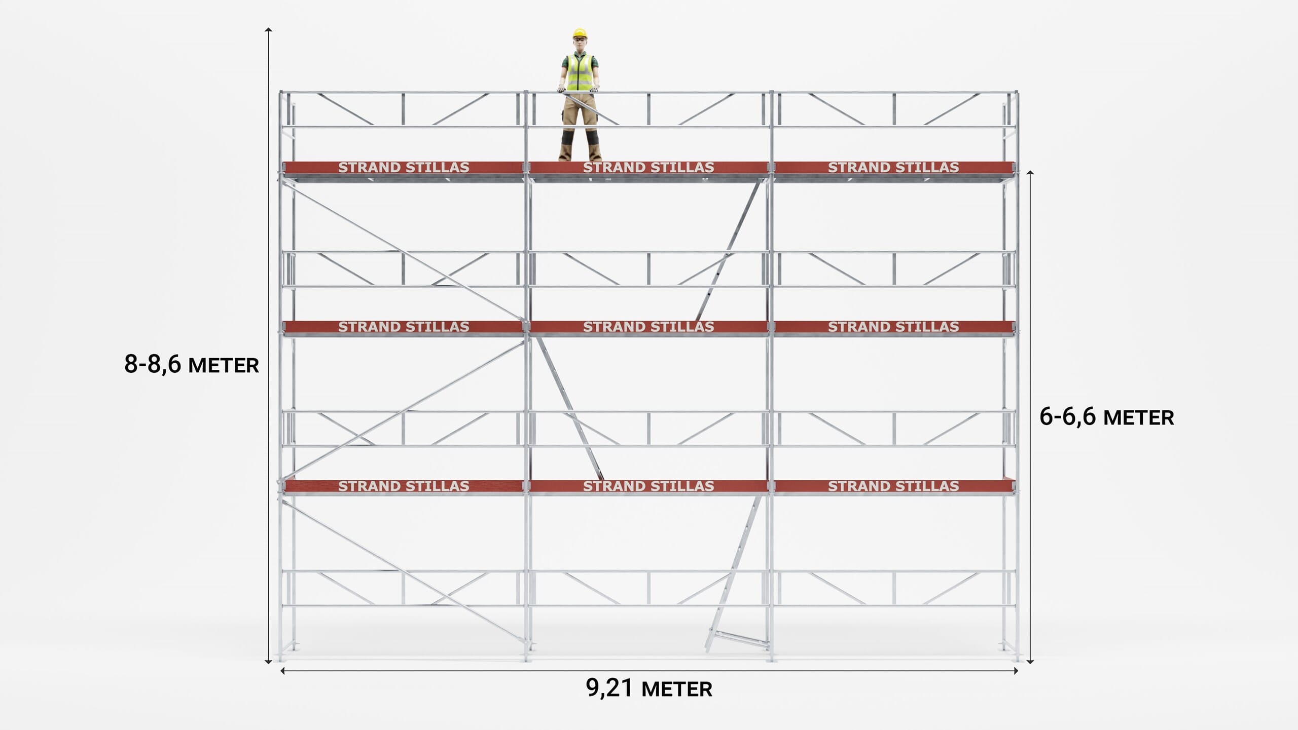Stillaspakke 33 leveres komplett med alle monteringsdeler som trengs for å bygge stillaset som avbildet. Stillaset kan også bygges lavere dersom det er ønskelig. Hovedkomponenter slik som rammer og rekkverk er fremstilt av aluminium, og stillasgulv leveres med lettvekts kompositt eller aluminium. Dersom det er behov for tilleggsdeler, finner man det under fanen «Stillasdeler» i menyen.