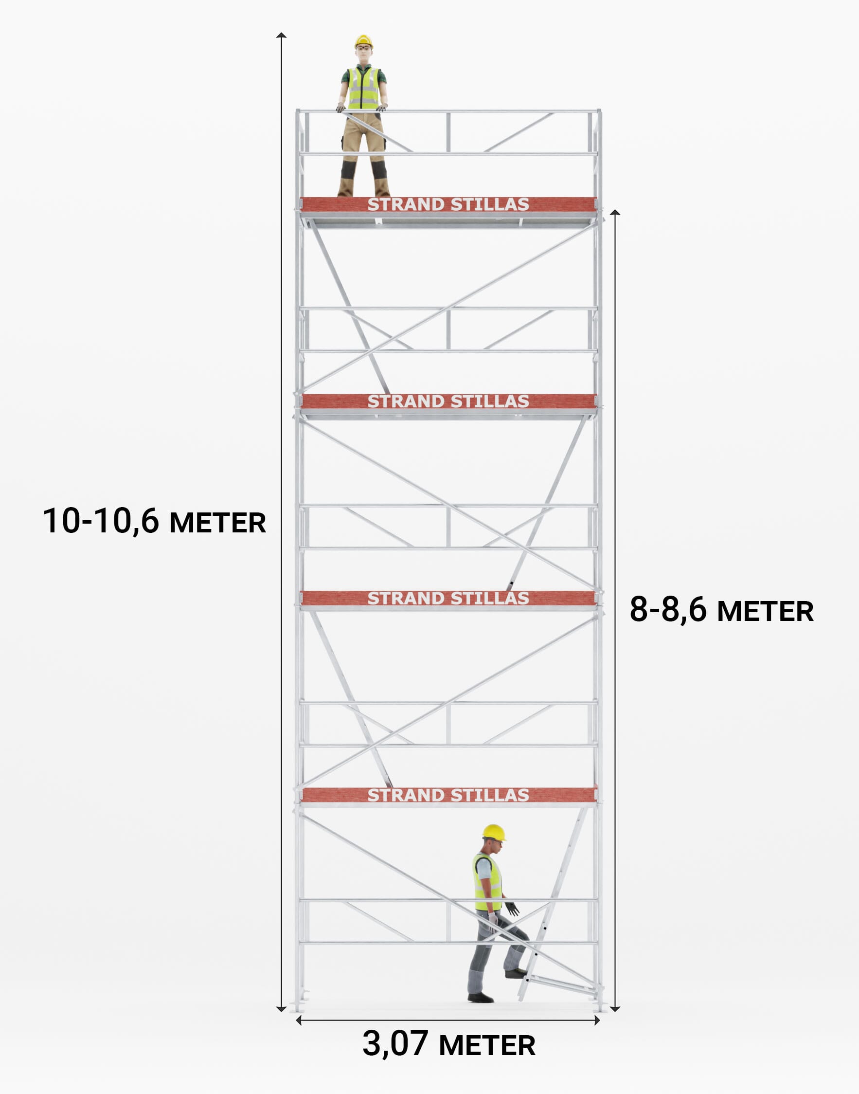 Stillaspakke 41 leveres komplett med alle monteringsdeler som trengs for å bygge stillaset som avbildet. Stillaset kan også bygges lavere dersom det er ønskelig. Hovedkomponenter slik som rammer og rekkverk er fremstilt av aluminium, og stillasgulv leveres med lettvekts kompositt eller aluminium. Dersom det er behov for tilleggsdeler, finner man det under fanen «Stillasdeler» i menyen.