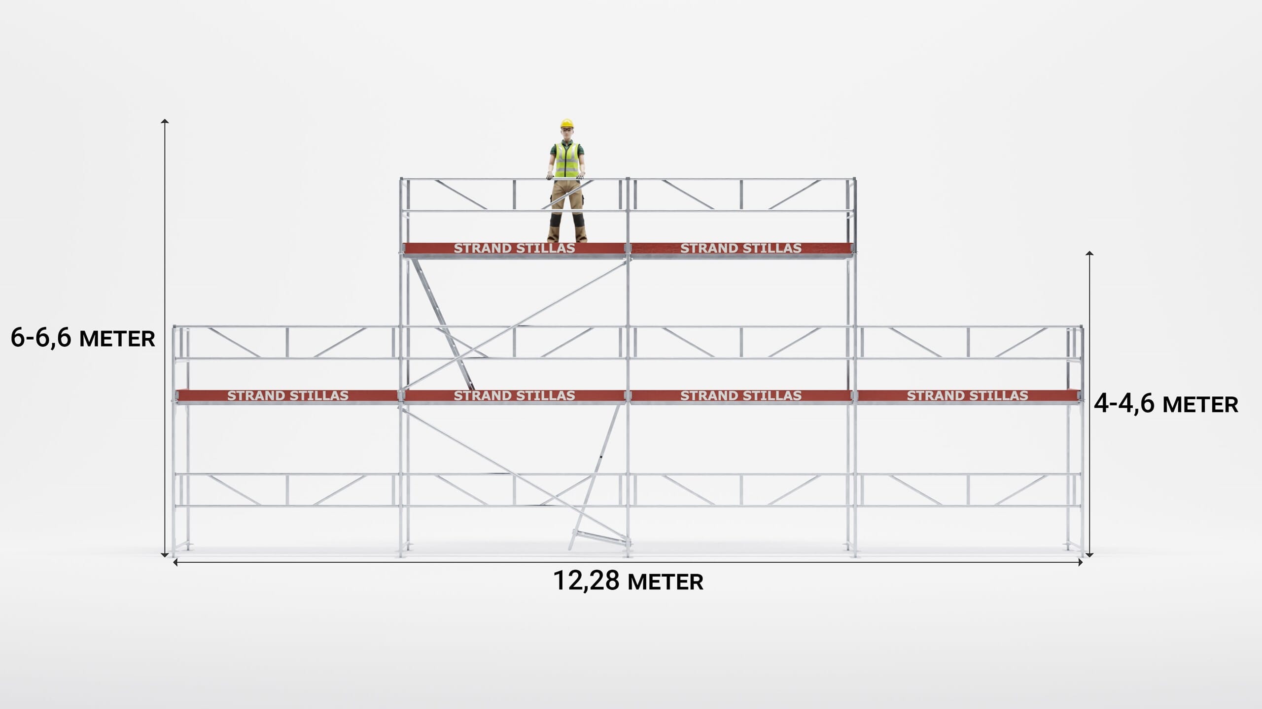 Stillaspakke Gavl 14 leveres komplett med alle monteringsdeler som trengs for å bygge stillaset som avbildet. Gavl 14 er tilpasset brede hus med en etasje + loft, garasjer etc. Hovedkomponenter slik som rammer og rekkverk er fremstilt av aluminium, og stillasgulv leveres med lettvekts kompositt eller aluminium. Dersom det er behov for tilleggsdeler, finner man det under fanen «Stillasdeler» i menyen.