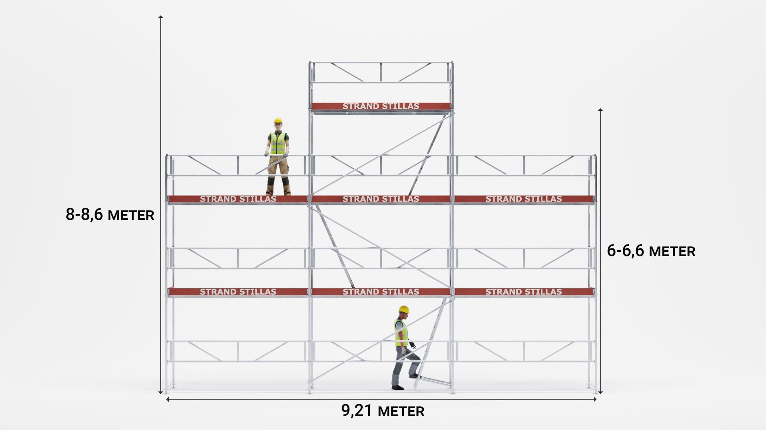 Stillaspakke Gavl 23 leveres komplett med alle monteringsdeler som trengs for å bygge stillaset som avbildet. Gavl 23 er den mest vanlige gavlpakken, og er tilpasset hus med 2 etasjer + loft. Stillaset kan også bygges en etasje lavere dersom det er ønskelig. Hovedkomponenter slik som rammer og rekkverk er fremstilt av aluminium, og stillasgulv leveres med lettvekts kompositt eller aluminium. Dersom det er behov for tilleggsdeler, finner man det under fanen «Stillasdeler» i menyen.
