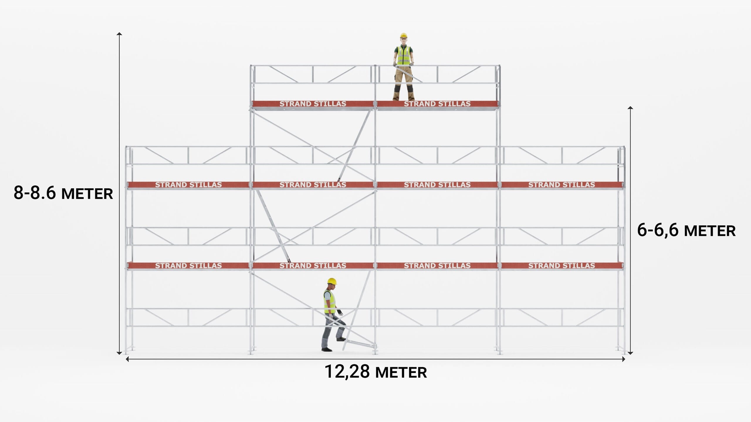 Stillaspakke Gavl 24 leveres komplett med alle monteringsdeler som trengs for å bygge stillaset som avbildet. Gavl 24 er tilpasset litt bredere hus med 2 etasjer + loft. Stillaset kan også bygges en etasje lavere dersom det er ønskelig. Hovedkomponenter slik som rammer og rekkverk er fremstilt av aluminium, og stillasgulv leveres med lettvekts kompositt eller aluminium. Dersom det er behov for tilleggsdeler, finner man det under fanen «Stillasdeler» i menyen.