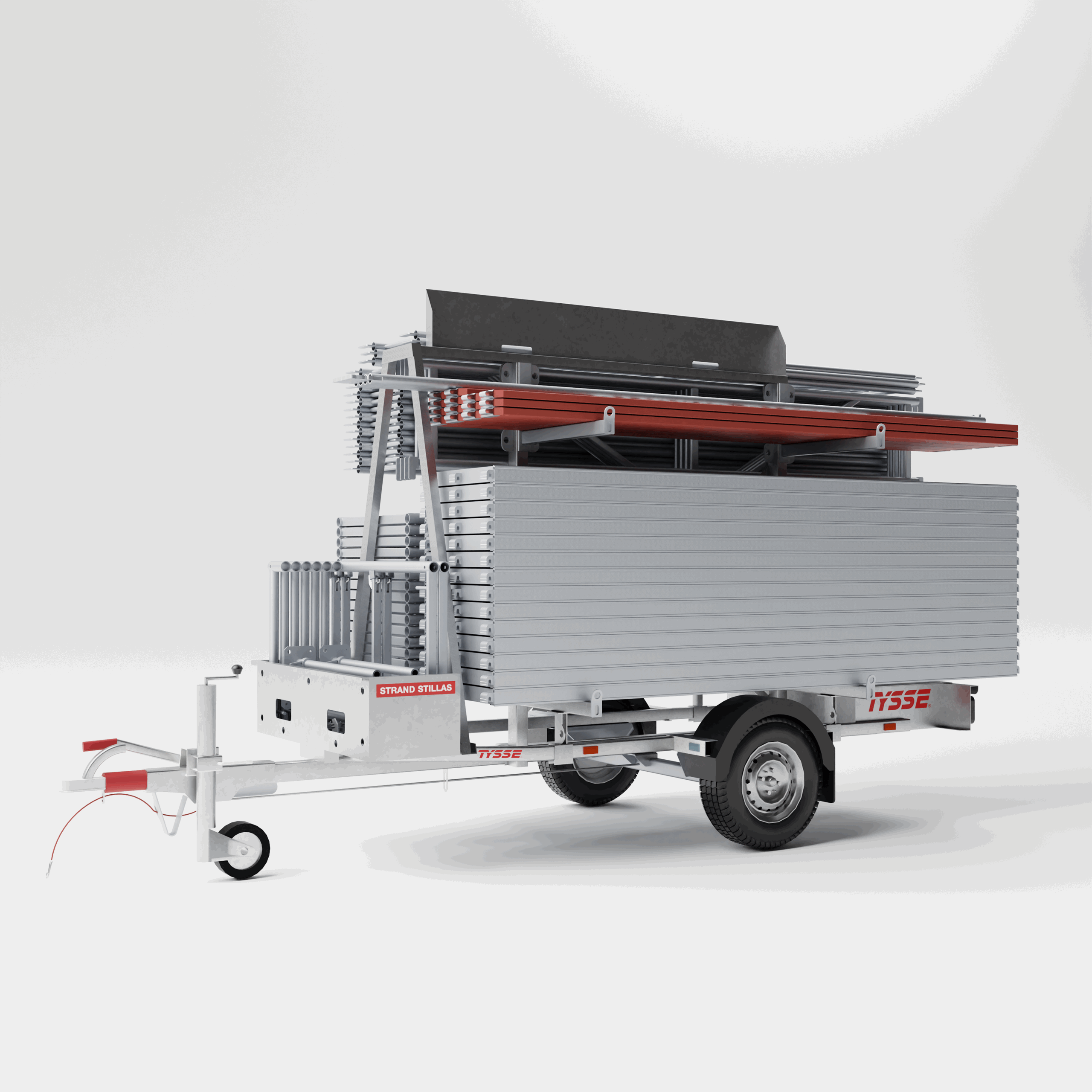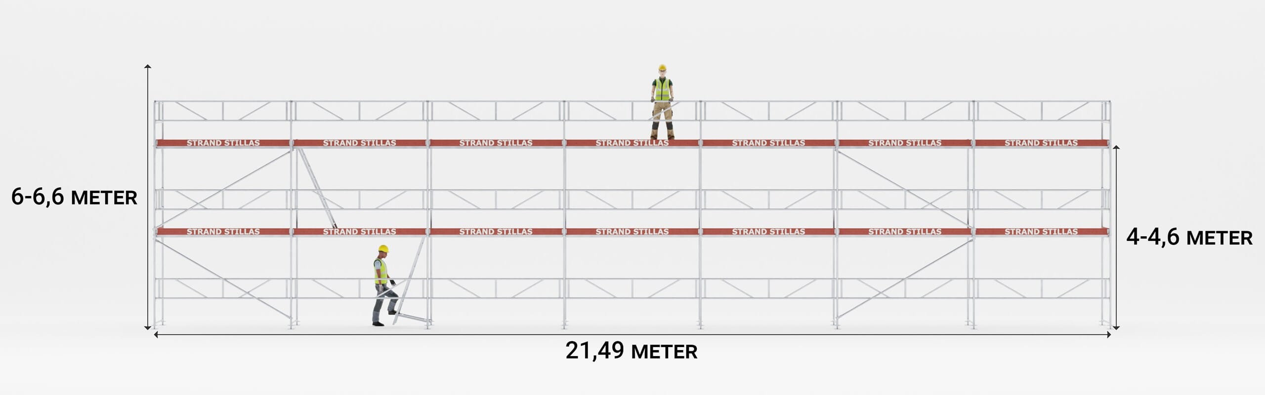 Hovedkomponenter slik som rammer og rekkverk er fremstilt av aluminium, og stillasgulv leveres med lettvekts kompositt.